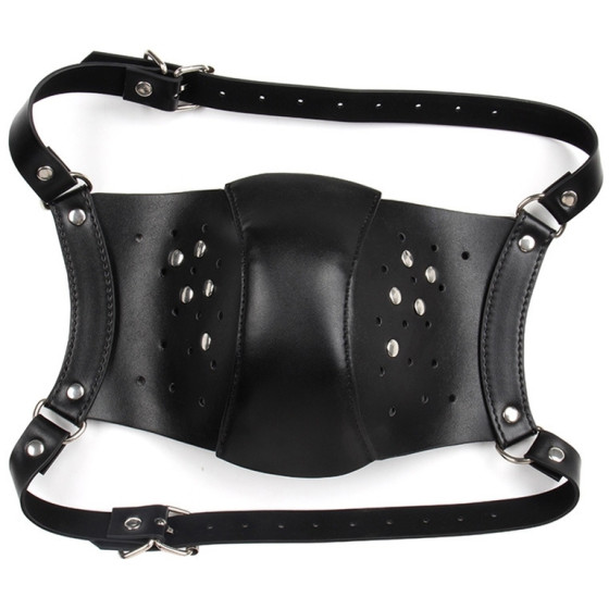 Ce masque Punk noir est un accessoire conçu pour des jeux SM. Il couvre le visage en cache le nez et la bouche.Il a une bande large de 15cm avec des trous et des rivets métalliques.Avec des sangles ajustables à l'arrière.