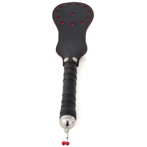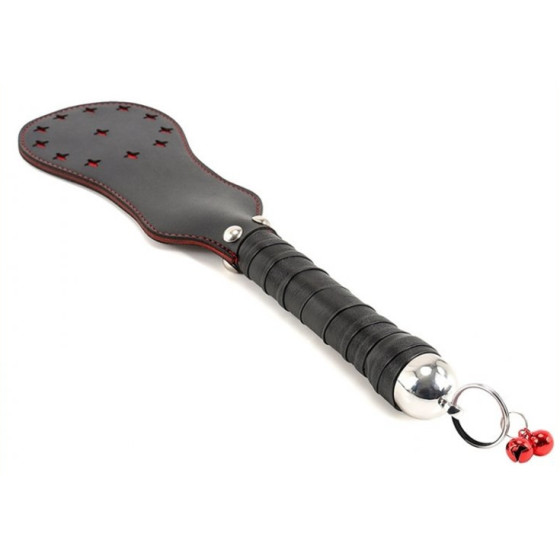 Ce paddle en simili est conçu avec la partie haute de 17 x 10cm avec une forme arrondie et des étoiles rouges en surface.Le manche possède des grelots rouges.
