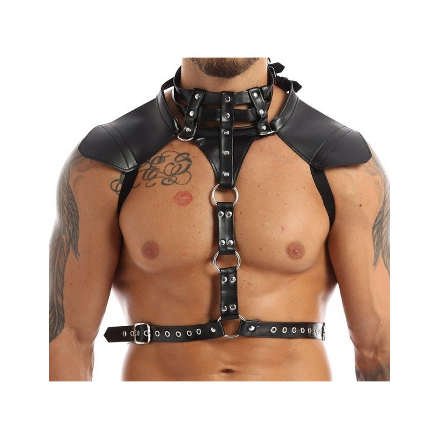 Ce harnais en simili est conçu avec des accessoires variés qui permettent de couvrir le torse et de le mettre en valeur.Il est composé de deux parties couvrant les épaules, des sangles passant sous les bras et sur le devant.La partie présente sur le cou donne un style encore plus sexy et SM.