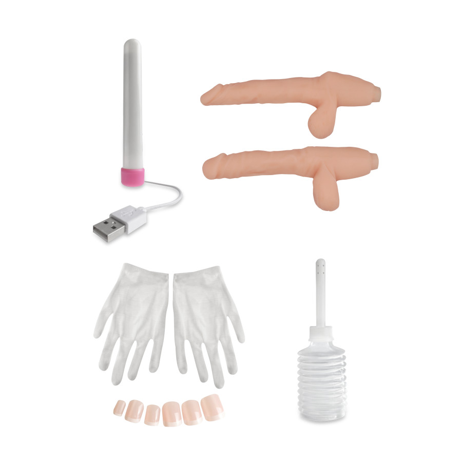 Inclus: - Élément chauffant USB pour le corps - 1 Boule de poitrine - La Sous-vêtements- Lait corporel / lubrifiant - Nettoyant pour jouets - Poudre de renouvellement - Irrigateur nettoyant - 1 Pénis accessoire supplémentaire - Manuel d'instructions