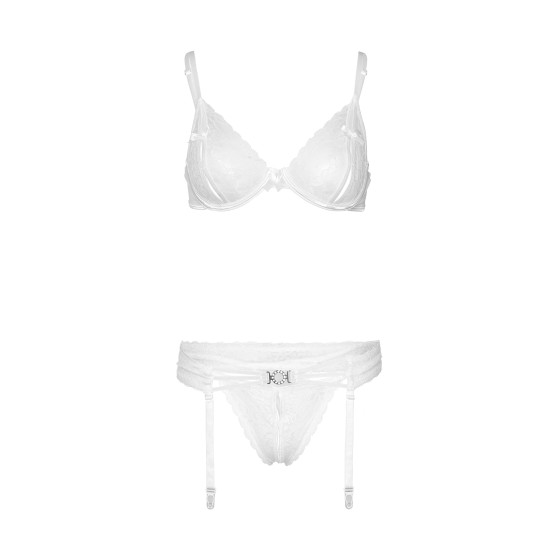 Ensemble blanc avec le soutien-gorge, le porte-jarretelles et le string.