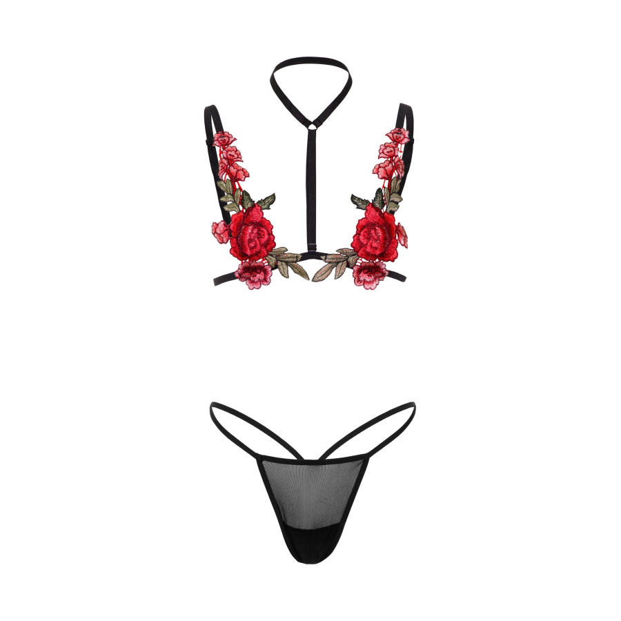 Ensemble avec un string et un soutien-gorge fin avec une rose sur chaque sein.