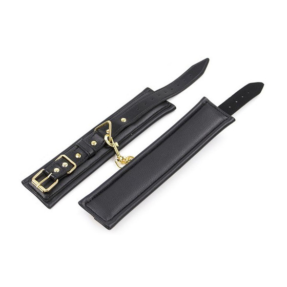 Menottes réalisées en faux cuir avec:- deux menottes reliées par des attaches et une chaînes couleur Or;- un rembourrage pour les poignets assurant un bon confort.