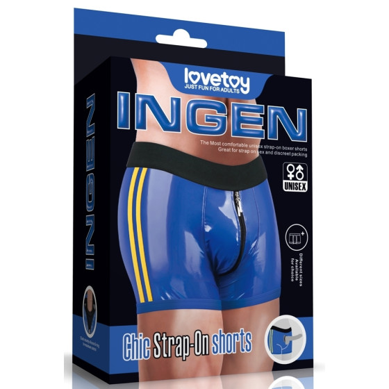 Blue boxer dildo holder with front zip.Easy placement of all dildo types (suction cup, hollow dildo).