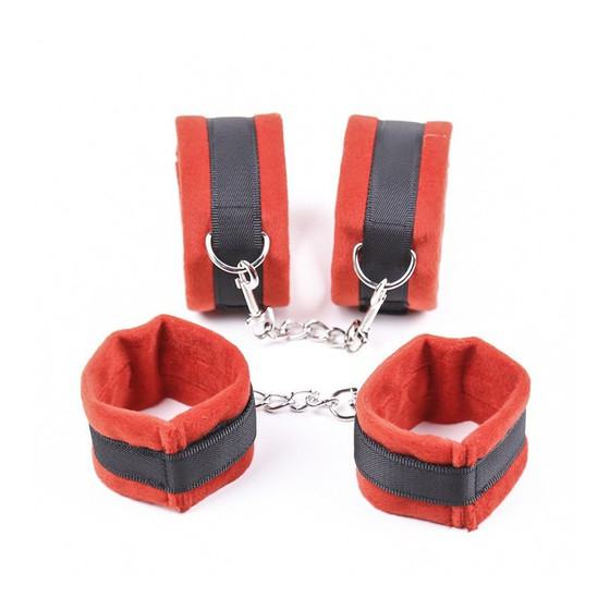 Ce Pack Bondage est constitué:- de menottes de poignets;- de menottes de cheville;- de pinces tétons;- d'un accessoire de chatouille, plumet rouge;- d'un masque occultant les yeux.