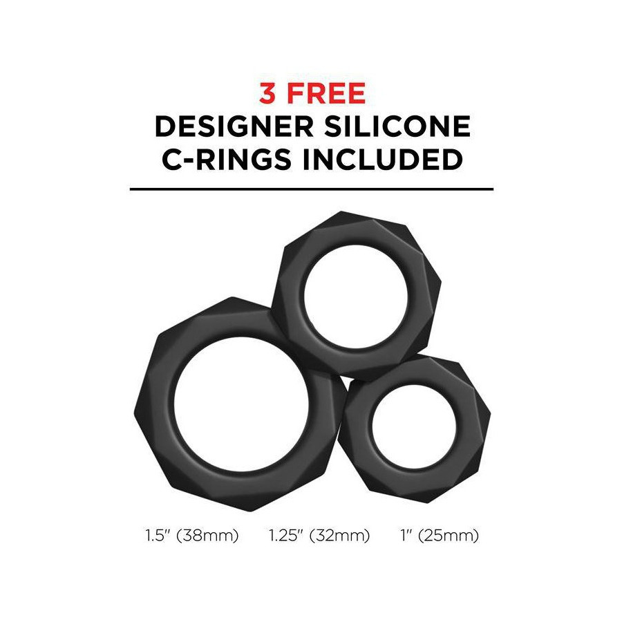 Fourni avec 3 cockrings en silicone, de la crème hydratante et un nettoyant pour votre sextoy.
