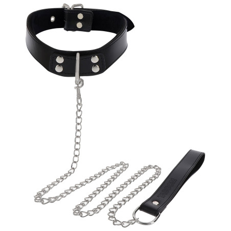 le collier en simili de 3cm de largeur et l'intérieur doux en polyester la chaîne en métal de 1m de longueur un tour de cou de 34 à 44cm.