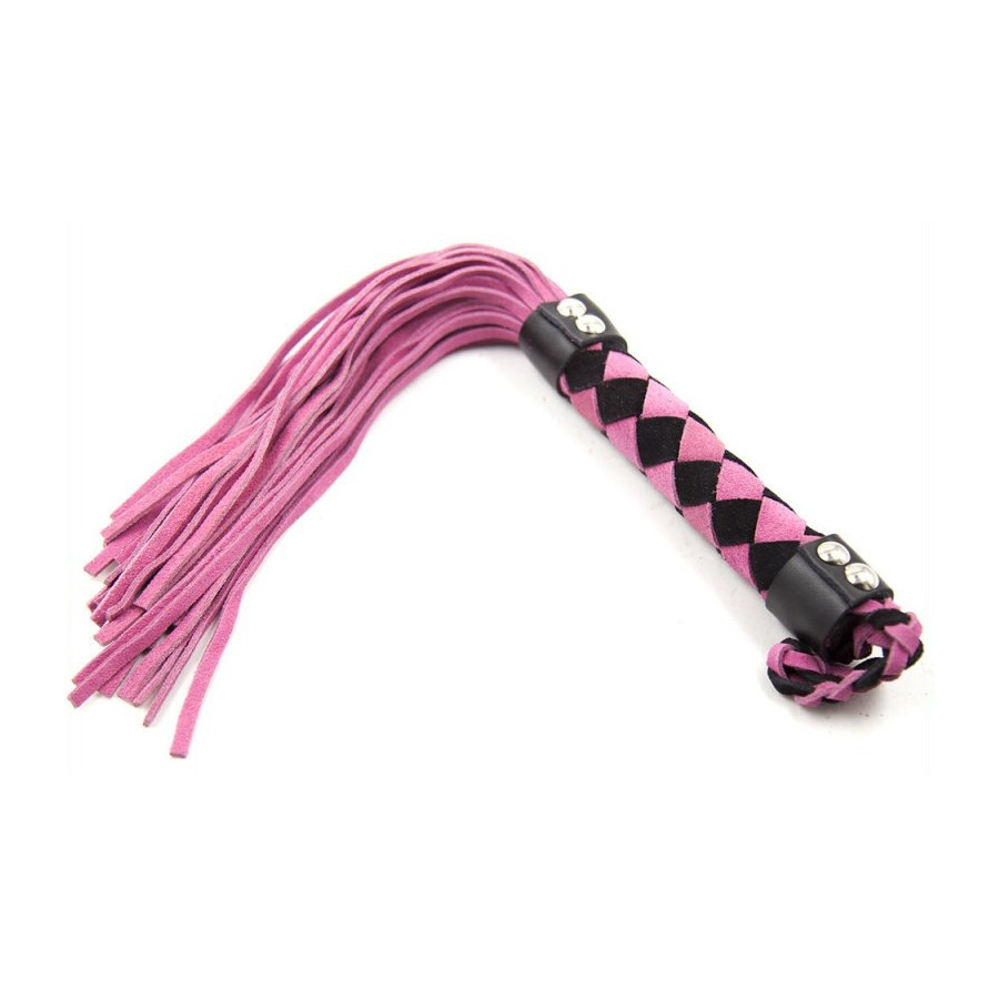 Le martinet Joker est réalisé avec des lanières souples de 23cm. Elles ont un aspect cuir sans peau et apportent de la douceur.Le manche a un décor en damier noir et rose.