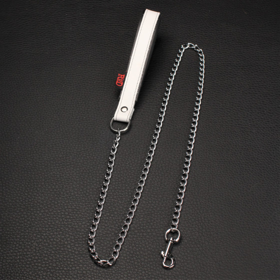 Cette laisse est composée d'une chaîne en métal d'1 mètre avec un mousqueton. Elle permet d'augmenter les possibilités de jeu SM.La poignée est réalisée en cuir véritable avec une bande blanche centrale. Elle mesure 19cm.