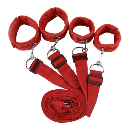 Ce kit est composé de 4 liens et attaches rouges avec des menottes fourrure (fausse fourrure).Les sangles sont ajustables et mesurent 1.50m au maximum.Une sangle centrale passe sous le lit (max 1.40m).