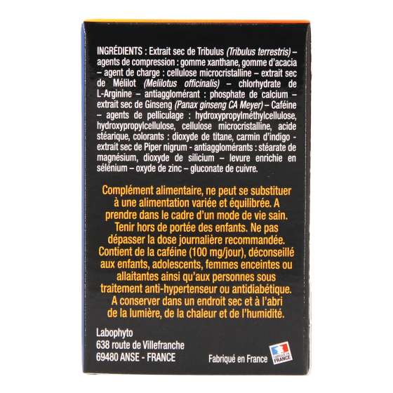 Informations nutritionnelles pour 2 comprimés:Extrait de tribulus (fruit): 450mg / Extrait de Mélilot (parties aériennes): 250mg / Extrait de Ginseng (racine): 100mg / Extrait de Piper nigrum (fruit): 50mg / Caféine: 100mg / Arginine: 200mg / Cuivre: 1mg (100% AR*) / Sélénium: 55microngramme (100% AR*) / Zinc: 10mg (100% AR*) *Apports de référence