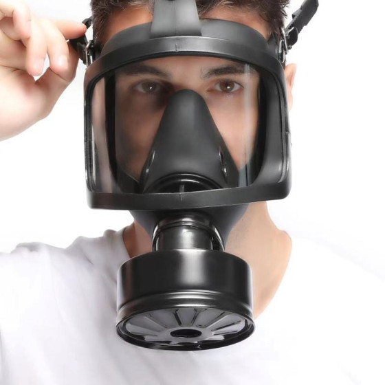 Masque à gaz avec une large visière et le filtre.Sangles ajustables derrière le visage.