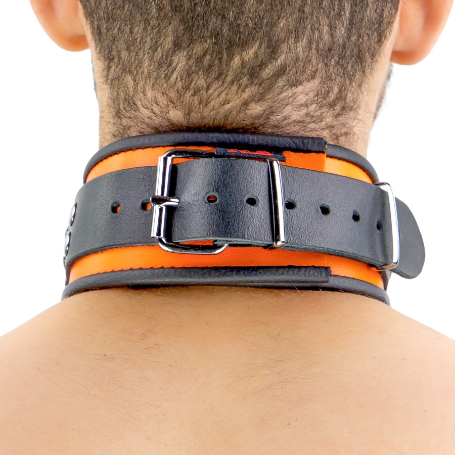 Ce collier en cuir Orange et noir est un accessoire de la marque The Red.Il se compose de :