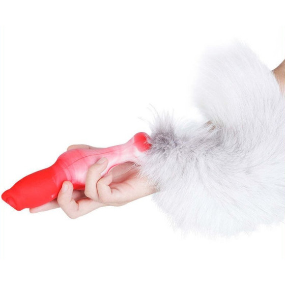 la queue fourrure blanche de 34cm le plug en silicone avec une forme de sexe de chien (dimensions 19 x 6.3cm).